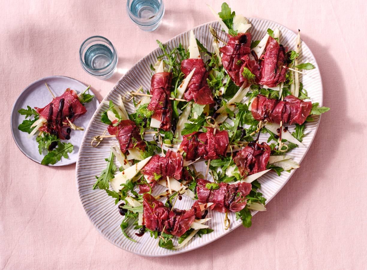 Met deze bresaolarolletjes met manchegopuntjes en cremaceto loopt elke borrel op rolletjes.