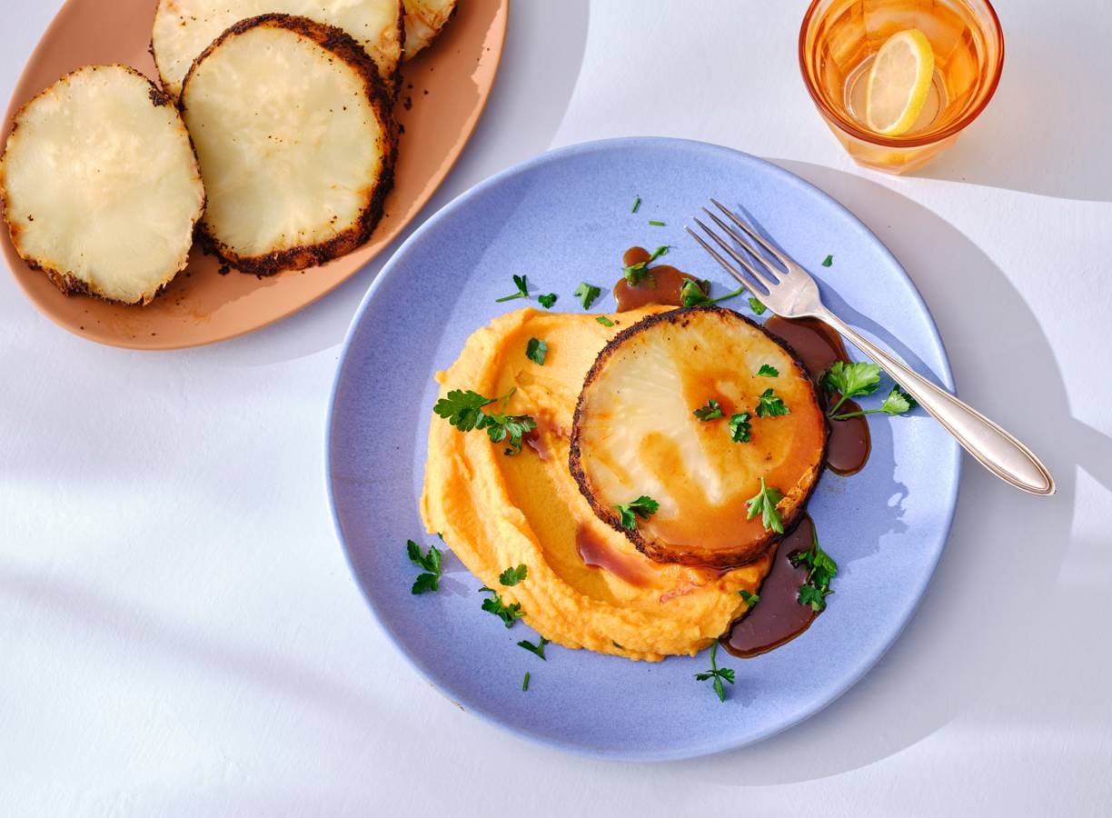 Geroosterde knolselderij met koffierub, -jus en pompoenpuree
