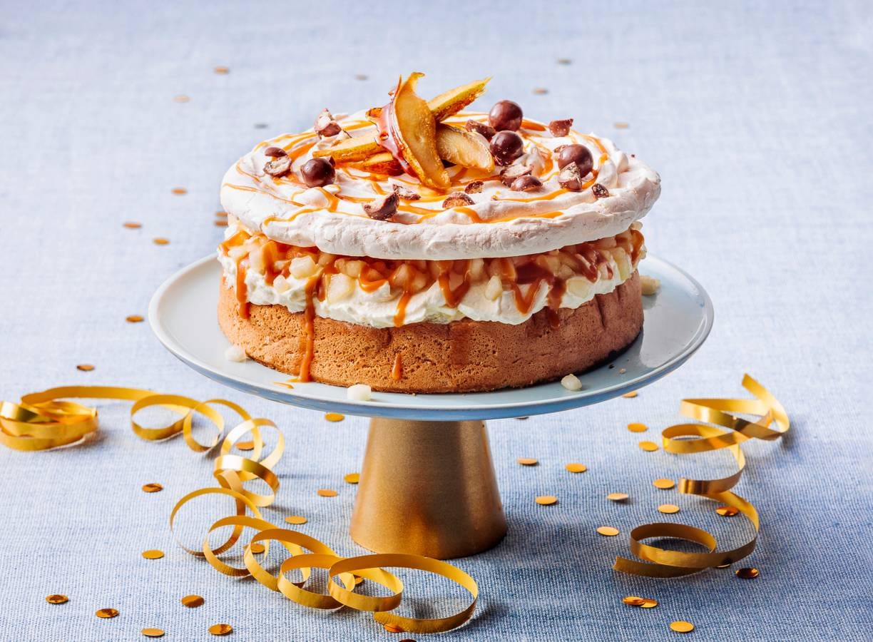Leg de cake op een schaal. Snijd eventueel de donkere bovenkant van de cake. Snijd de cake eventueel bij, om dezelfde maat als de meringue te krijgen. Bedek de cake met het slagroommengsel, houd 3 el slagroom apart. Verdeel de blokjes peer over de slagroom. Verdeel flink wat karamelsaus over de peer. Schep hier de achtergehouden slagroom op. Dek af met de meringue en versier de bovenkant met de peer met karamel, de crunch choco’s en extra karamelsaus.