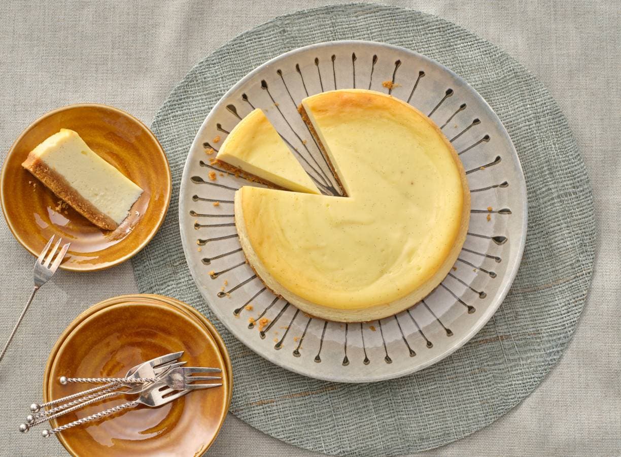 Schep in de vorm en strijk glad. Bak ca. 1 uur en 30 min. in het midden van de oven. De cheesecake is klaar als de buitenkant stevig is en het midden nog niet. Laat 1 uur en 30 min. in de oven afkoelen tot kamertemperatuur. Laat de cheesecake vervolgens 30 min. buiten de koelkast afkoelen. Zet de cheesecake voor het serveren minimaal 1 uur afgedekt in de koelkast.