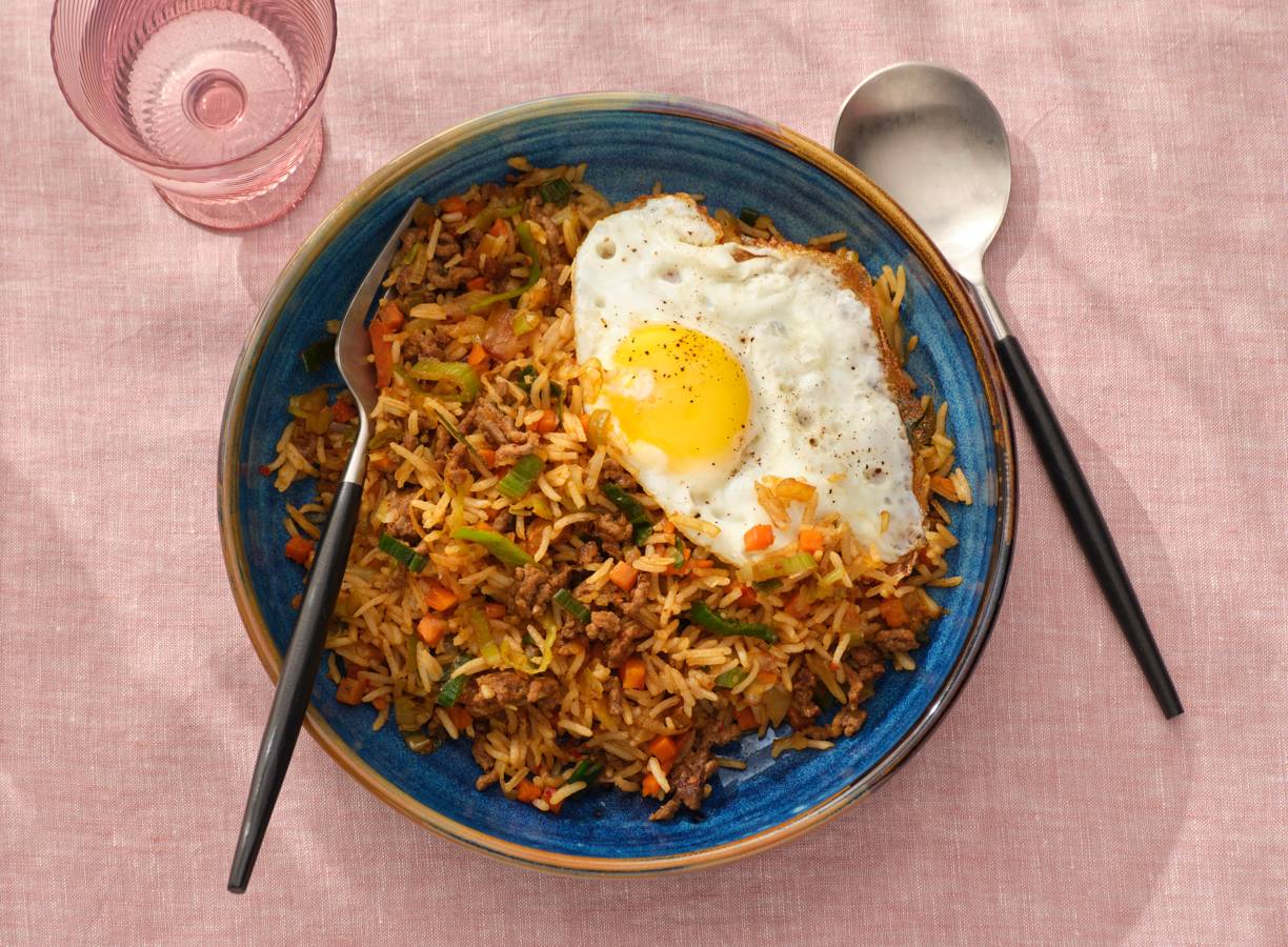 De lekkerste nasi krijg je als je de rijst eerst helemaal laat afkoelen. Daarna gaat alles in de wok met lekker veel groenten, gehakt, ketjap en sambal. Aan tafel!