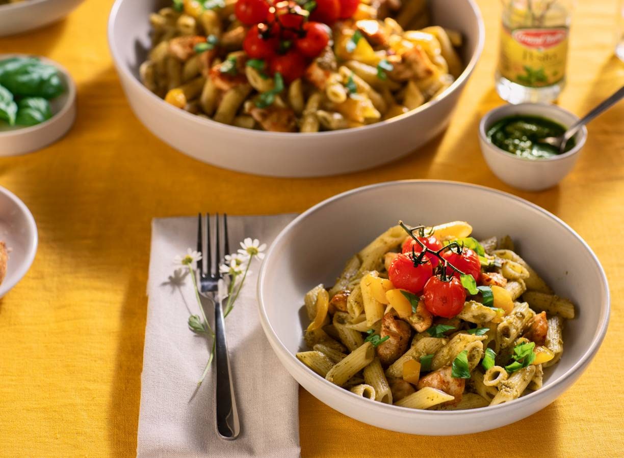 Meng de Penne met de Pesto alla Genovese. Voeg vervolgens de kip, paprika, courgette en de helft van de cherrytomaten (zonder takjes) toe. Bewaar de andere helft van de cherrytomaten voor de garnering.