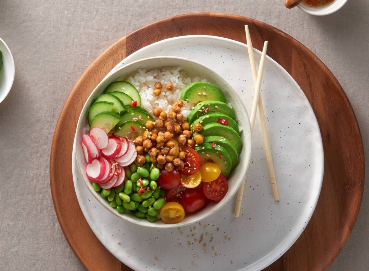 Verdeel de groenten en kikkererwten over de poke rijst.