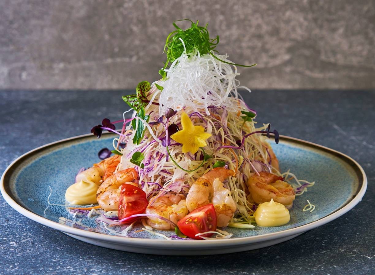Koken met Kewpie: laagjes van ragfijne koolsalade met gegrilde garnalen en een fluweelzachte dressing dankzij romige Japanse mayo.