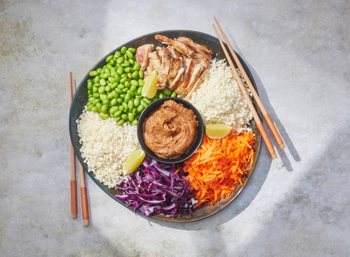 Deze bowl zit vol met groente en is keto-proof dankzij de bloemkoolrijst in plaats van gewone rijst. Lekker met gebakken kip en een dot pindasaus.