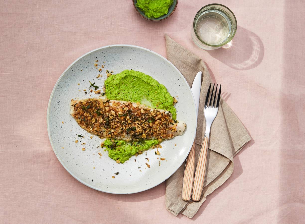 Vispakketje met notenkorst en prei-tuinerwtenpuree