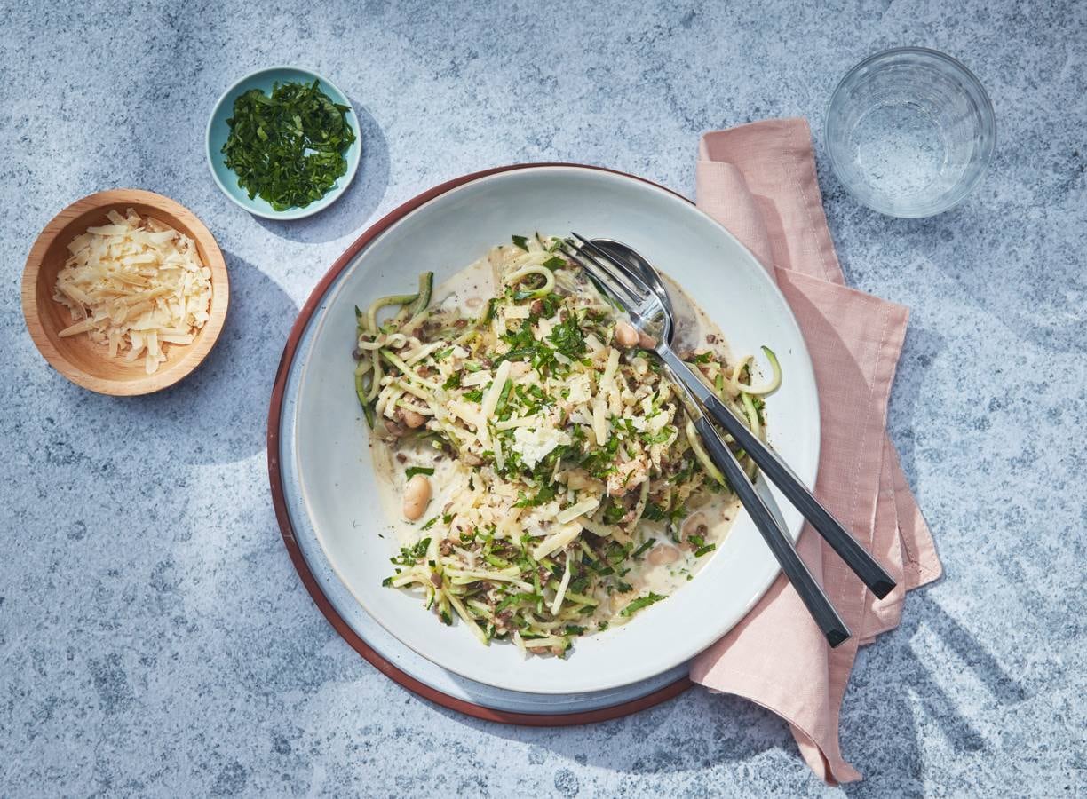 Of je het nu courgetti of courgette-spaghetti noemt, dit gerecht (keto) met paddenstoelengehakt is in 20 min. klaar. Dankzij de witte bonen, slagroom en kaas is het lekker romig. Heerlijk met wat verse peterselie.