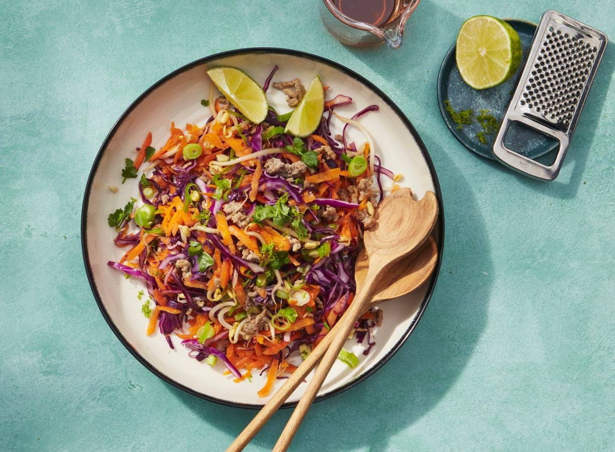 Schep je bord maar vol met kruidig gehakt, frisse rodekool, peen en taugé. Maak 't af met koriander en limoenrasp. Extra fijn: deze roerbak is paleo en budgetproof!