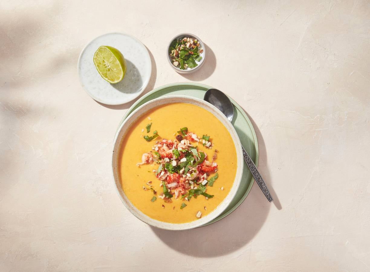 Zet het vuur uit en pureer de soep met de staafmixer. Breng op smaak met peper en eventueel zeezout. Verdeel de soep over kommen en verdeel de rivierkreeftjes erover. Garneer met het koriander-amandelmengsel en breng op smaak met limoensap.