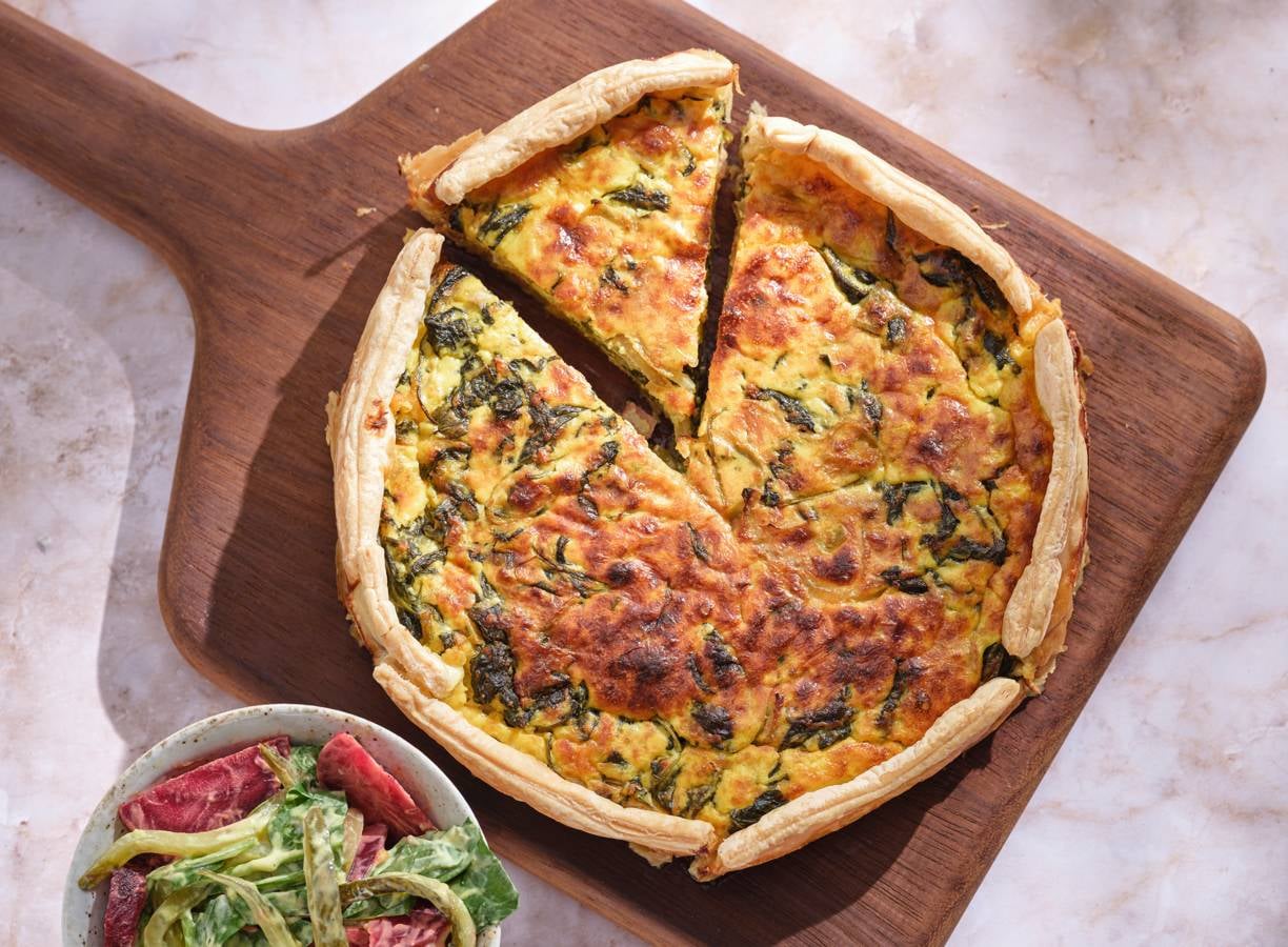 Spinaziequiche met piccalilly en rodebiet-augurkensalade