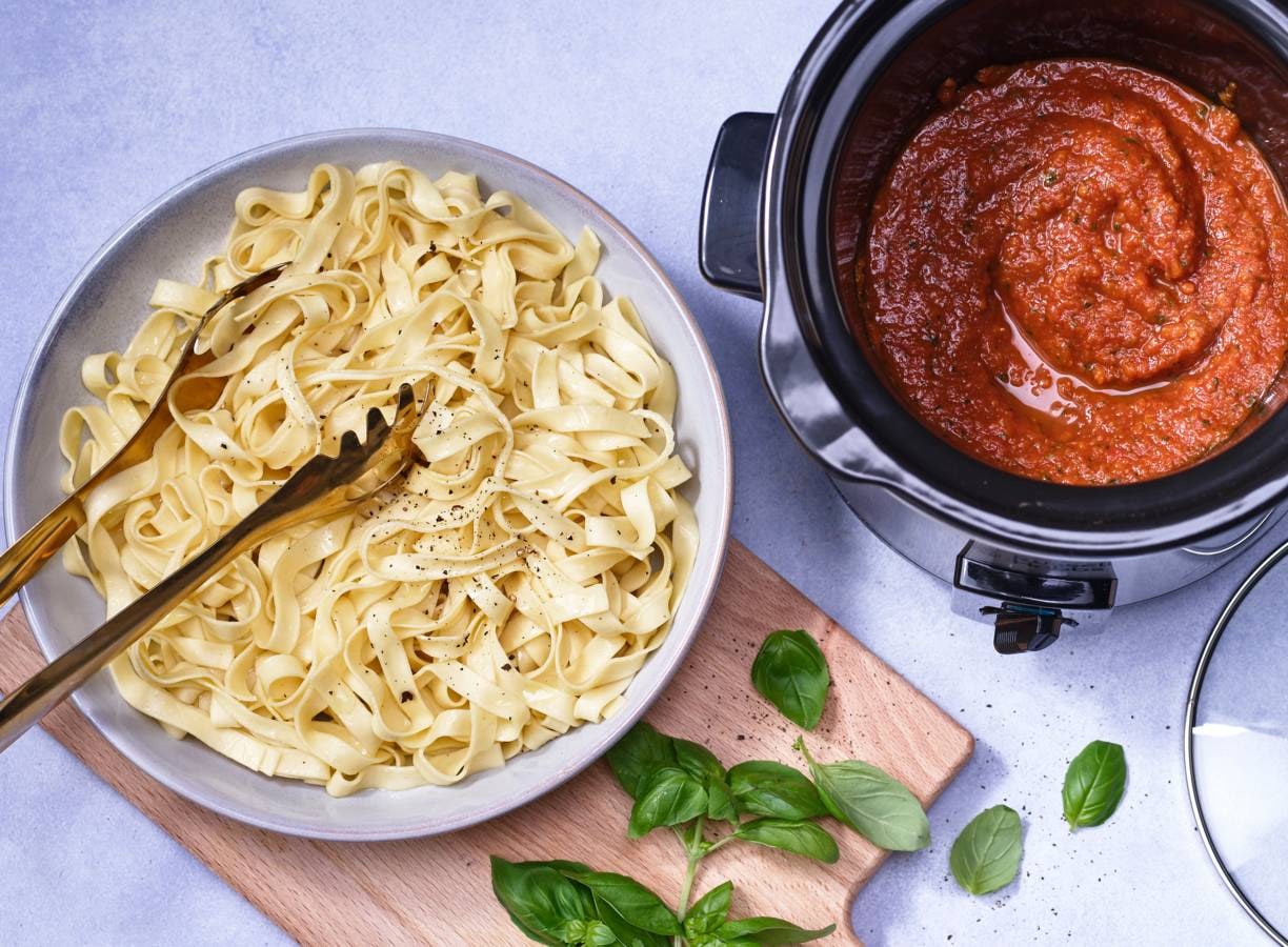 Makkelijk uit de slowcooker: pastasaus! De ingrediënten gaan in de slowcooker en je hebt er geen omkijken meer naar.
