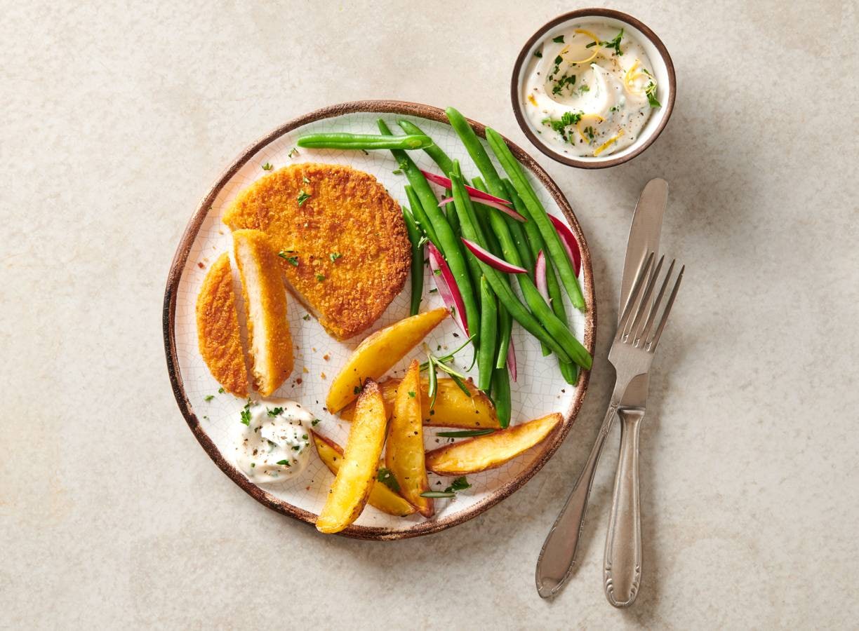 Snijd de peterselie fijn en meng met de mayonaise en het citroensap. Serveer de krokante burgers met de geroosterde aardappelpartjes, sperziebonen, uitjes en de mayonaise.