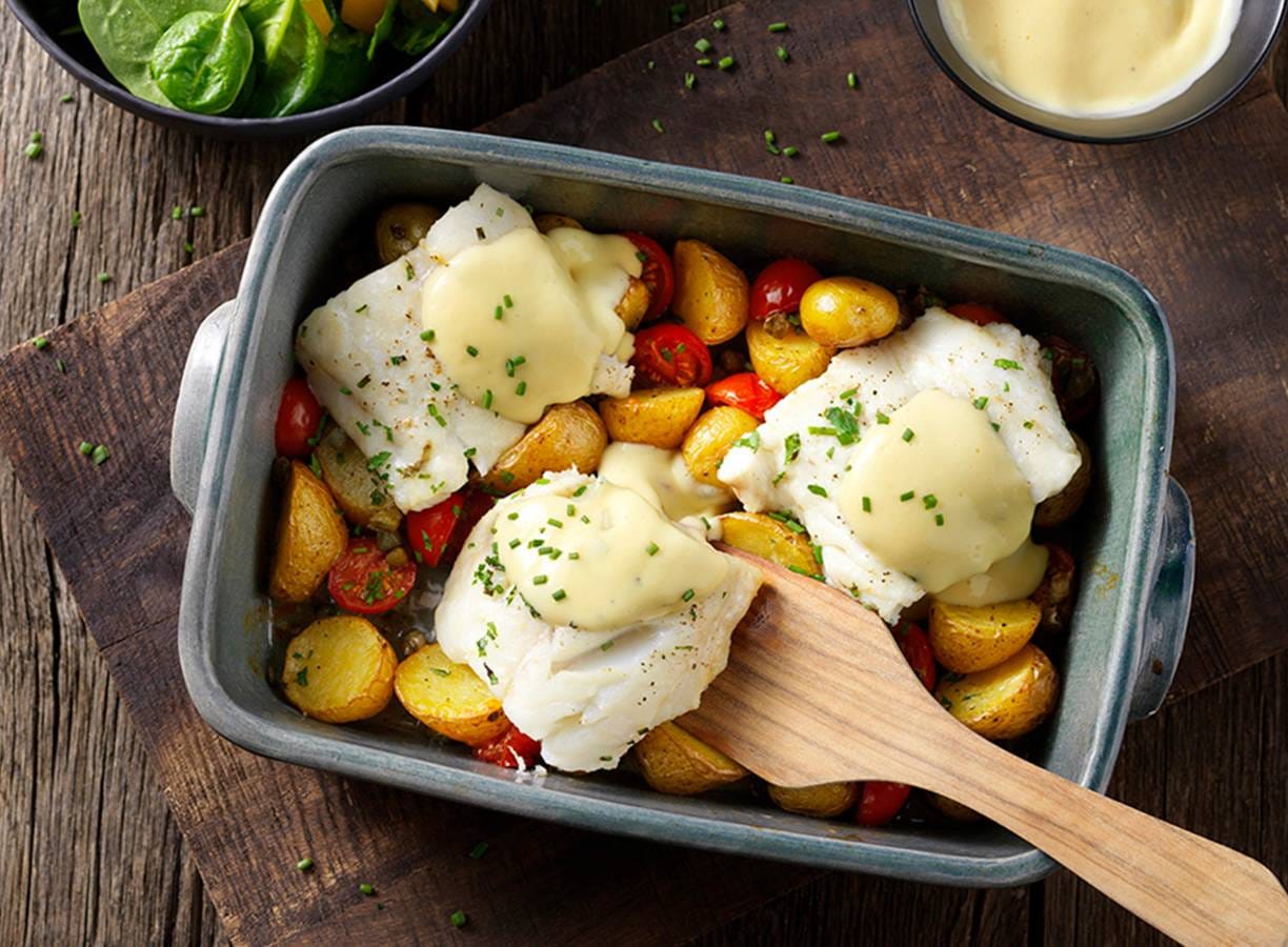 Koken met Maggi: Krieltjes, cherrytomaatjes en kappertjes in de oven met kabeljauw. Top af met romige Hollandaisesaus en serveer met een spinazie-paprikasalade.