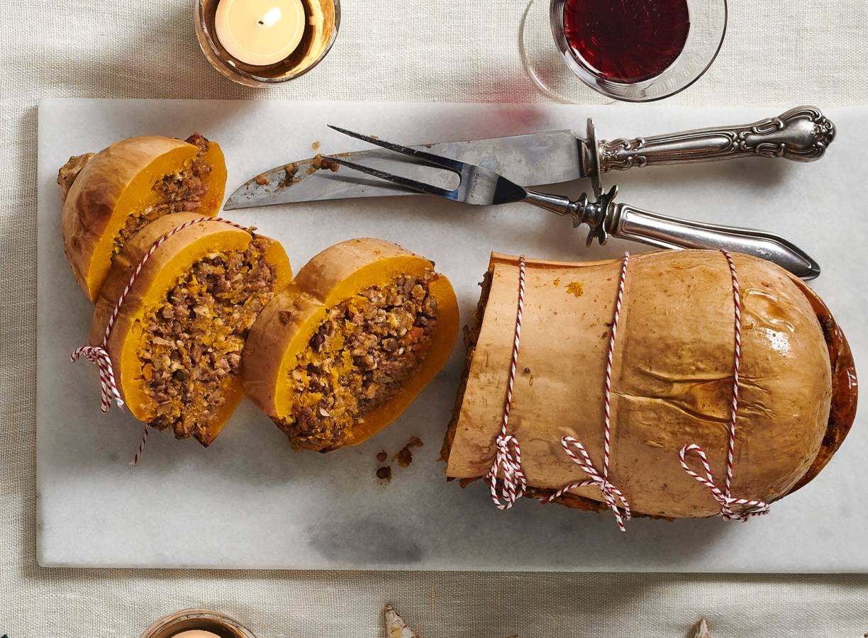 Koken met Beyond Meat: deze flespompoen vul je met vegan gehakt, linzen en champignons en serveer je met rodewijnjus. Genieten!