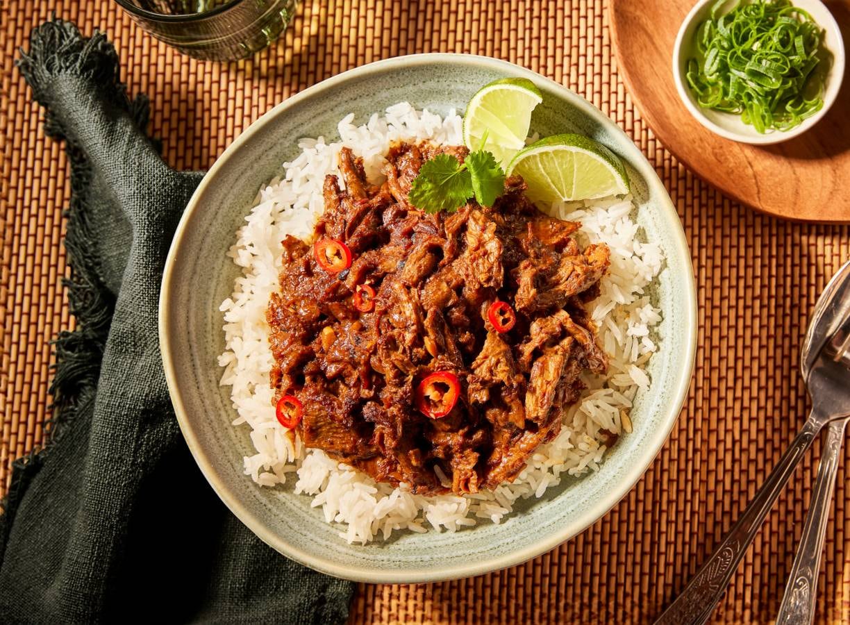 Serveer de gestoofde rendang met rijst, fijngesneden rode chili, een partje limoen en verse koriander. Eet smakelijk!