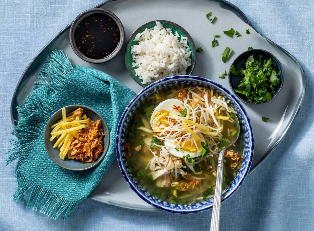 Een Surinaamse favoriet: saoto! Deze door de Surinaams-Javaanse klassieker geïnspireerde soep serveren we met o.a. rijst, gefrituurde mihoen, minifriet, een eitje en peperketjap van adjuma.