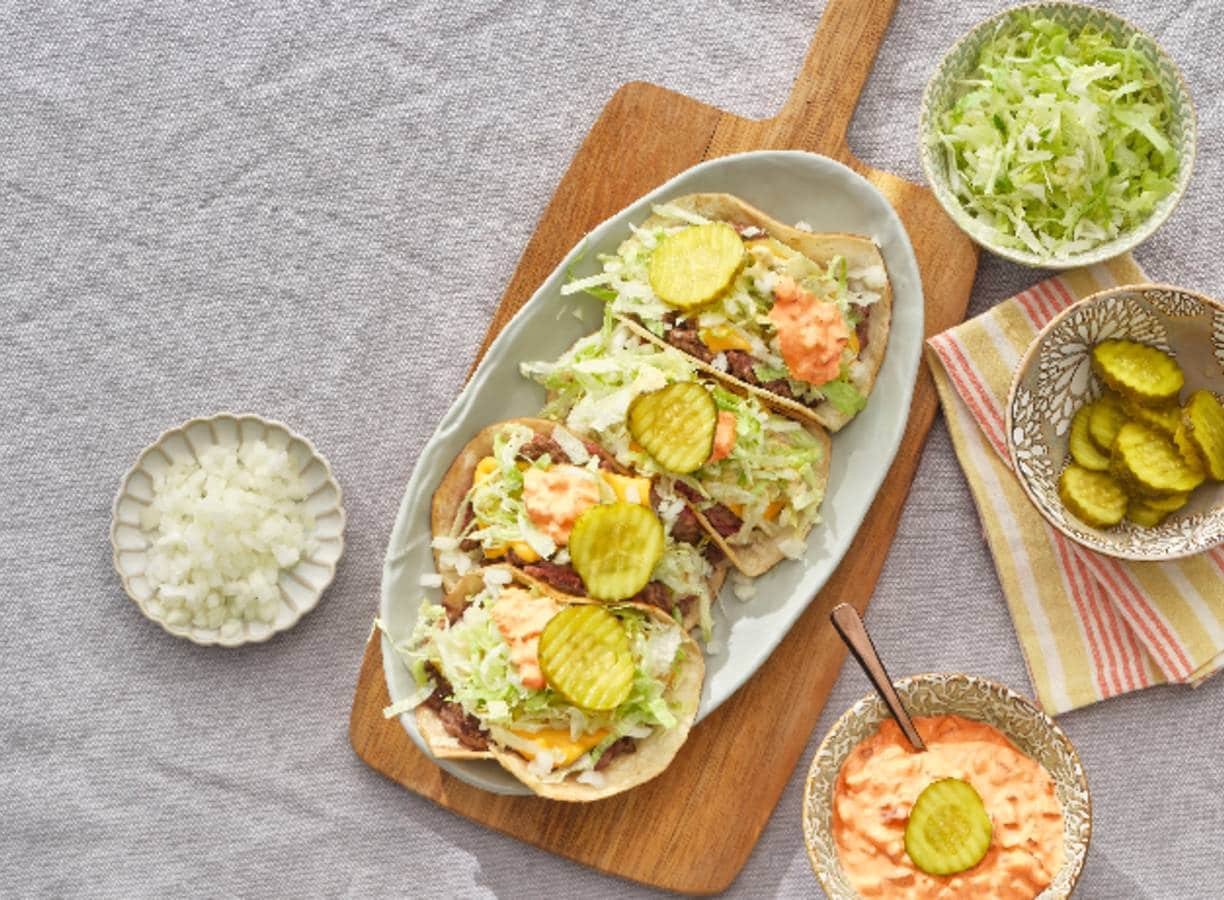Een Big Mac maar dan op een wrap? Heerlijk! Maak een sausje, bak de burgers met kaas en garneer met ui, augurk en sla. Serveer met frietjes en aan tafel.