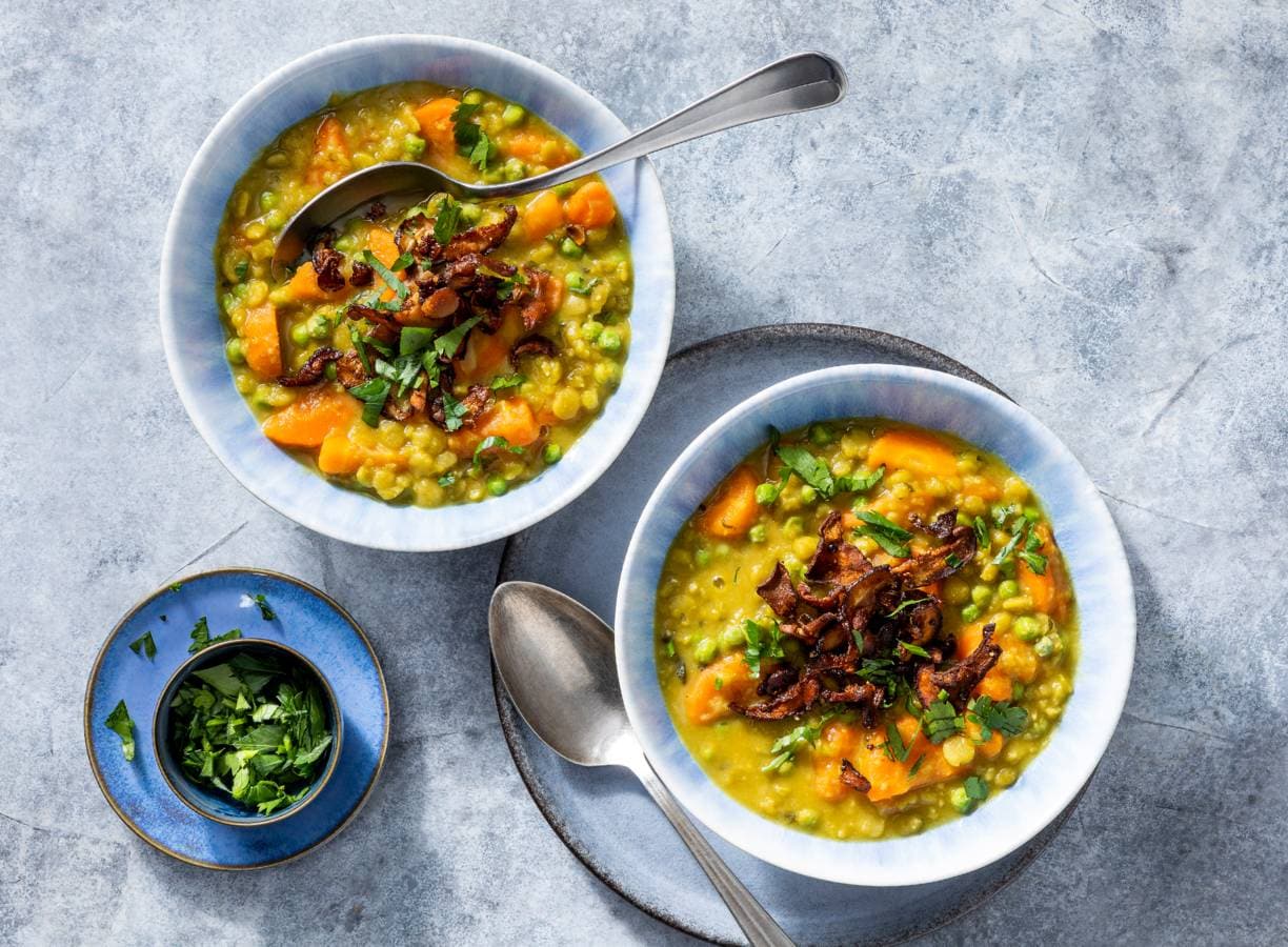 Een goedgevulde vegetarische erwtensoep op tafel zetten? Met krokant geroosterde shiitake in plaats van spekjes wordt dit een gegarandeerd succes.
