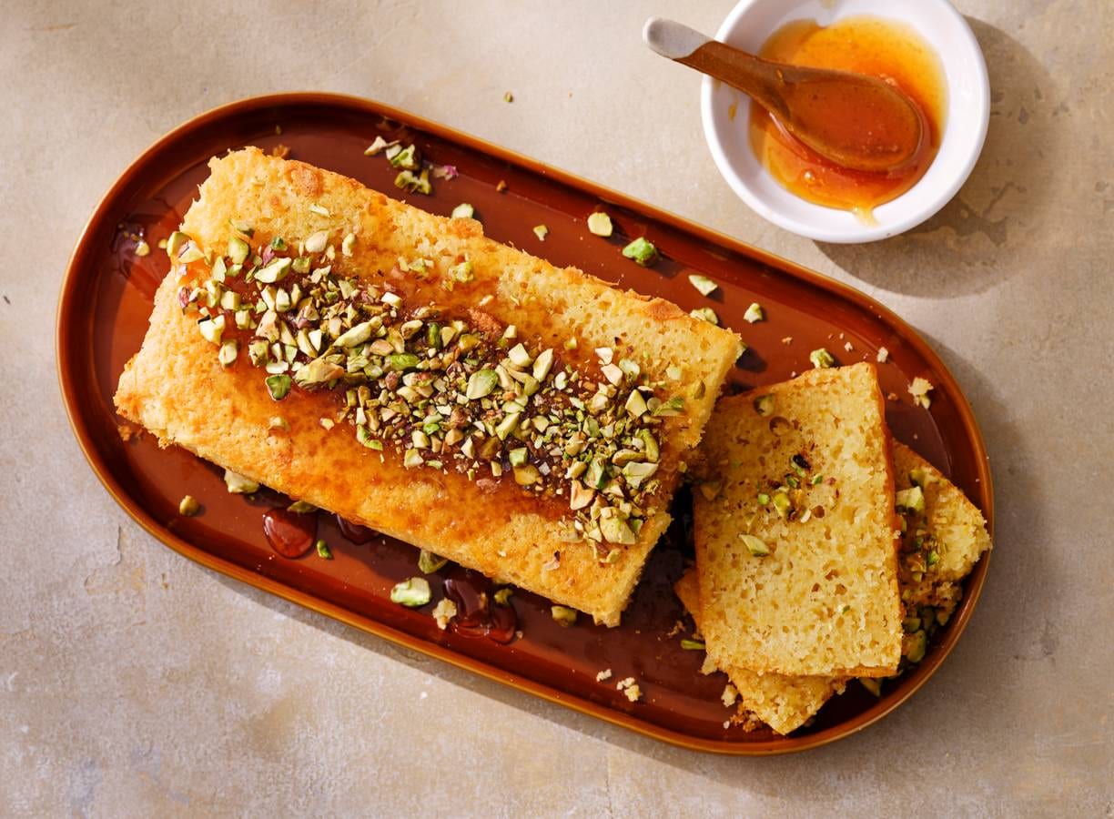 Cake klaar? Schenken maar, met siroop van sinaasappel en honing. En dan: lekker bestrooien met pistachenoten.