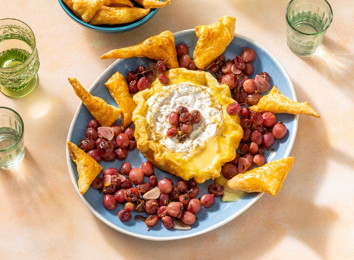 4. Bak de camembert de laatste 20 min. mee met de druiven. Leg de gebakken camembert en de losse deegstukken in een mooie schaal en verdeel de geroosterde druiven erover.