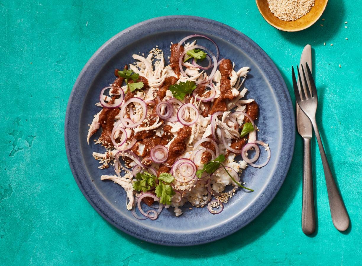 Mole (uitgesproken als mo-leh) is Mexicaans en betekent 'saus'. Verschillende gedroogde chilipepers, specerijen, zaden, pitten, noten, gedroogd fruit en (oude) maistortilla's zorgen voor de complexe, maar o zo heerlijke saus.