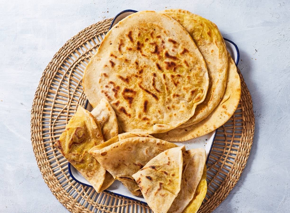 Verhit wat ghee of boter in een koekenpan en bak de rotiplaat aan beide kanten goudgeel en gaar. Herhaal stap 7 en 8 met de andere bolletjes deeg en de rest van de vulling.
