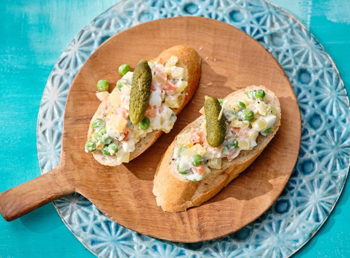 Ooit ontwikkeld door een Belgische chef in Rusland en nu een van Spanjes favorieten: ensaladilla rusa. De salade bestaat uit onder andere aardappel, erwten, cornichons en mayonaise. In deze versie maken we er een pincho van.