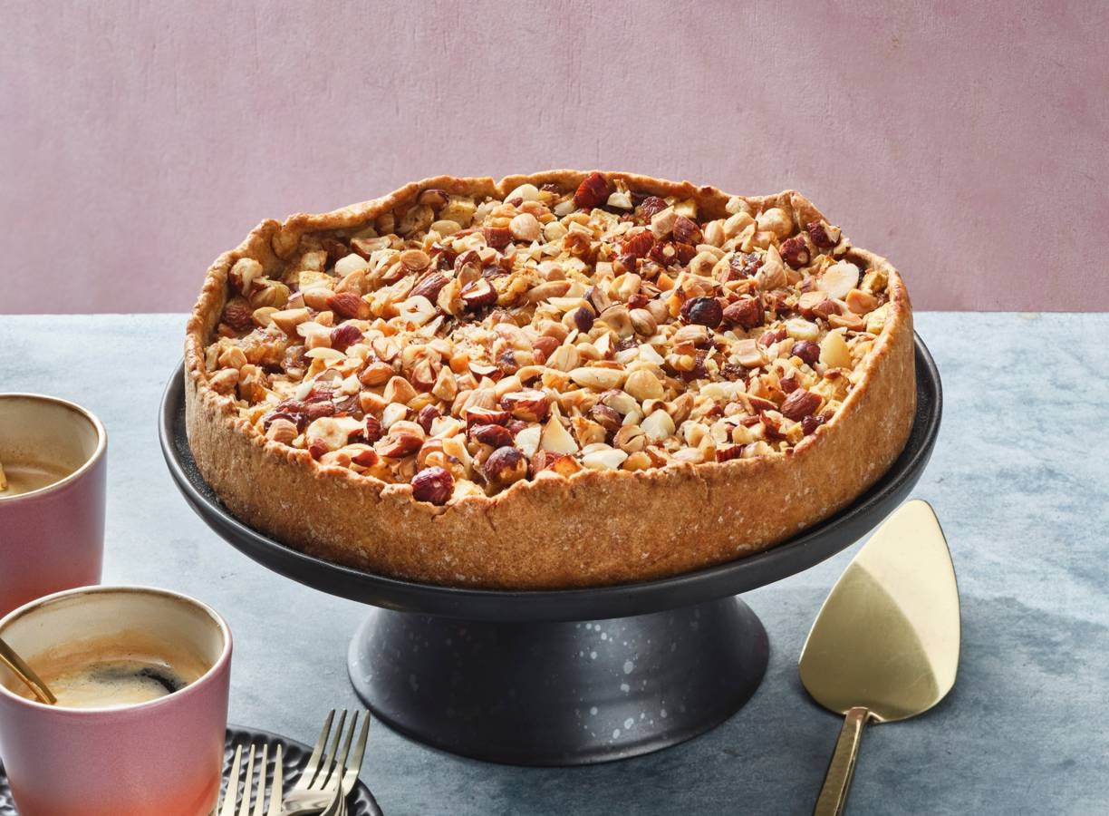 Verdeel de appelvulling over de bodem, druk aan. Verdeel de noten erover. Bak de taart in het midden van de oven in 40-45 min. goudbruin en gaar. Laat minimaal 1 uur afkoelen.