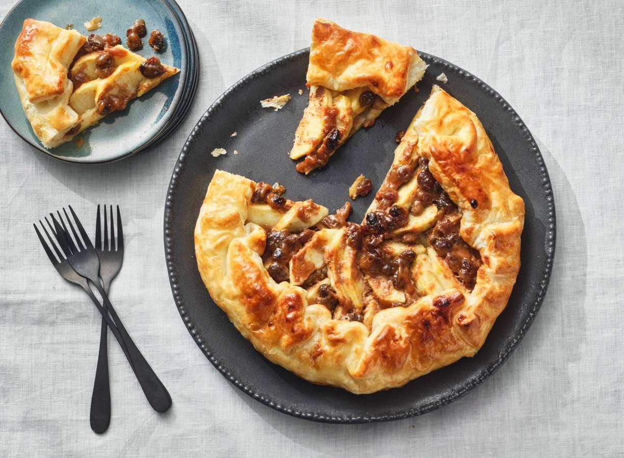 Verdeel de appelpartjes dakpansgewijs over het bladerdeeg. Verdeel de bebogeen met rozijnen erover. Vouw het overhangend deeg terug, als bij een galette. Kluts het ei en bestrijk de rand van de taart ermee.