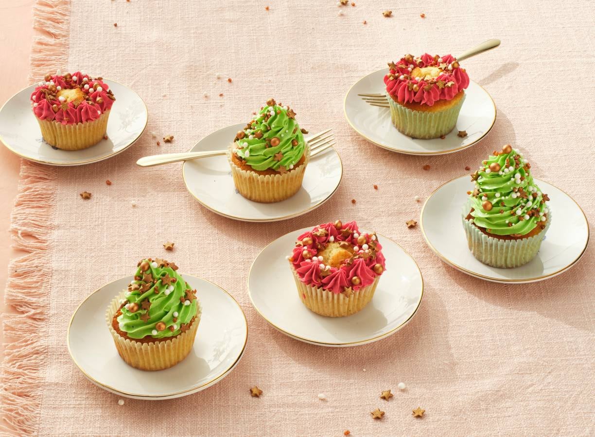 Meng de rest van de boter met de poedersuiker en klop 6-8 min. met de mixer tot een egale en luchtige crème. Meng de helft met de rode kleurstof en de andere helft met de groene kleurstof. Schep de botercrèmes in 2 spuitzakken (of spoel 1 spuitzak tussendoor om) en verdeel in mooie toeven over de cakejes.