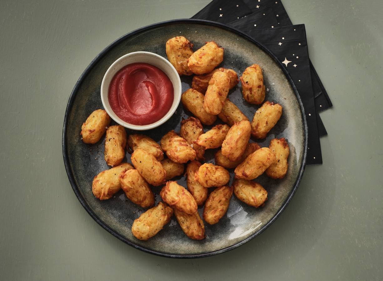 achtergrondinfo:Tater tots zijn een Amerikaans bijgerecht. Amerikanen kopen ze meestal kant en klaar uit de diepvries. Ze zijn uitgevonden in de jaren ’50 en populair als schoollunch. Meestal krijg je ketchup bij je tots.