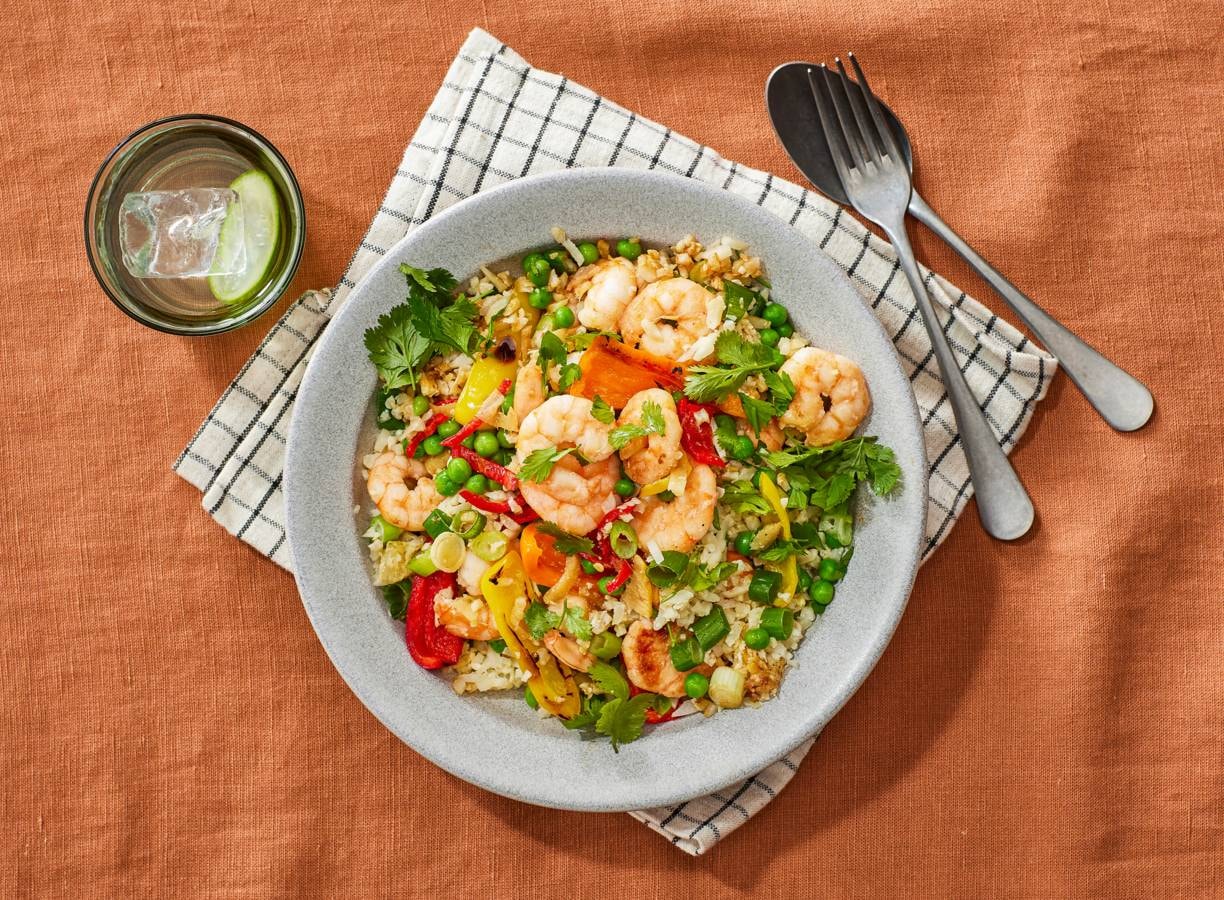 Bloemkoolrijstbowl met gebakken garnalen en paprika
