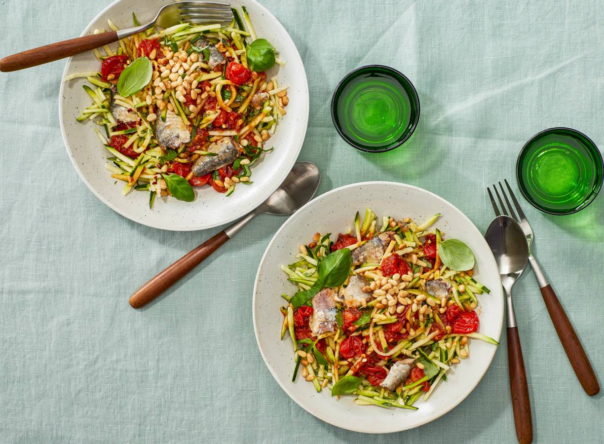 Courgettespaghetti met tomaten-basilicumsaus en sardines