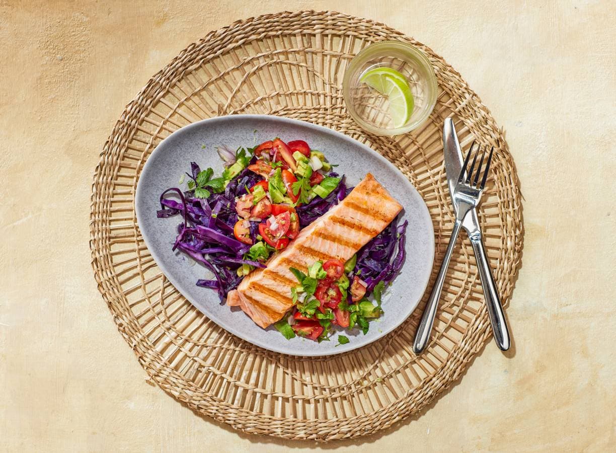 Gegrilde zalm met rodekool en avocado-tomatensalsa