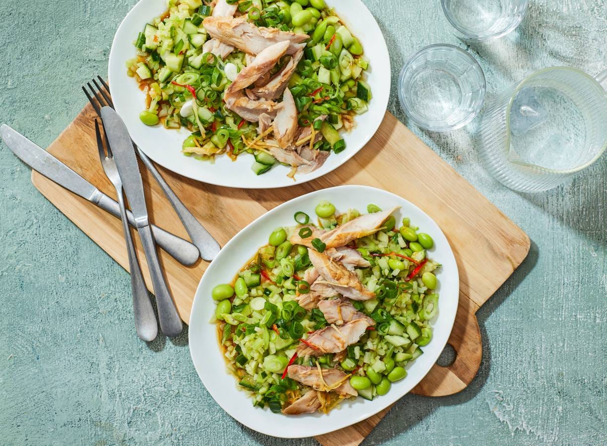 Meng de broccolirijst met de komkommer, sojabonen, bosui, rode peper, sesamolie, azijn en de rest van de sojasaus. Breng eventueel op smaak met peper en zout. Verdeel de makreel in stukken erop en de marinade erover.