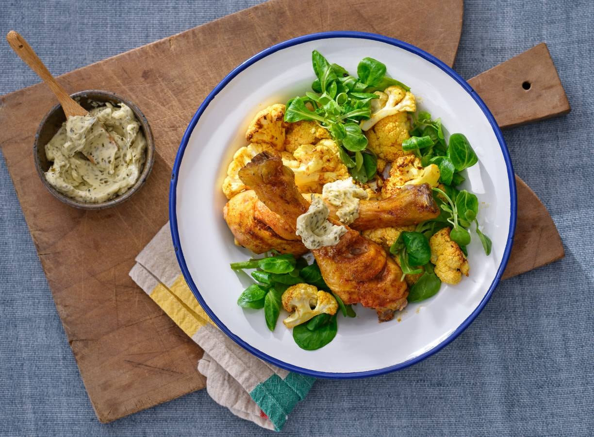 De met kerrie en knoflook gemarineerde bloemkool serveer je op een bedje van veldsla. Met daarbovenop? Drumsticks uit de oven, afgetopt met kruidenboter. Makkelijk, lekker en keto.