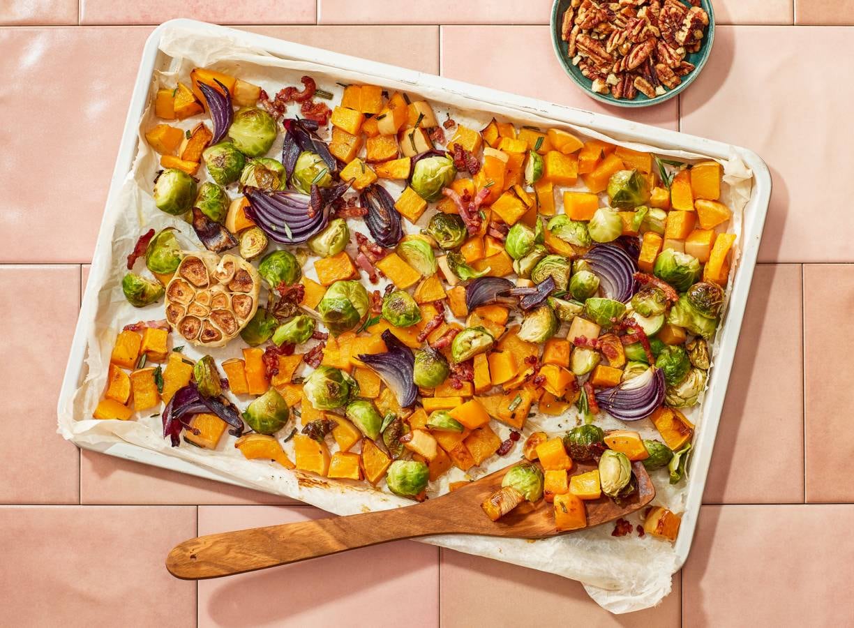 Traybake met pompoen, spruitjes, spekjes en gepofte knoflook