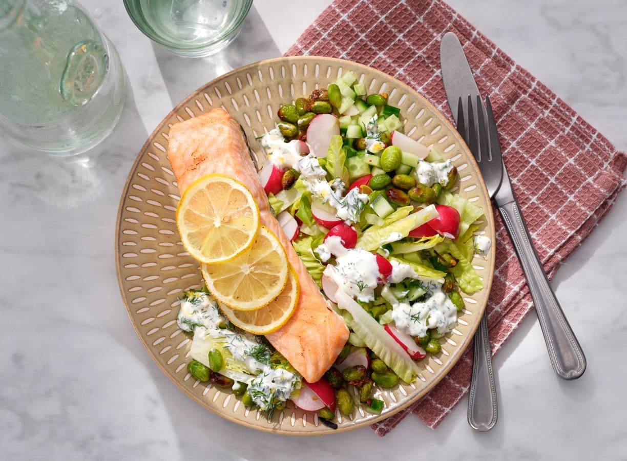 Zalm uit de oven met komkommersalade en geroosterde sojabonen