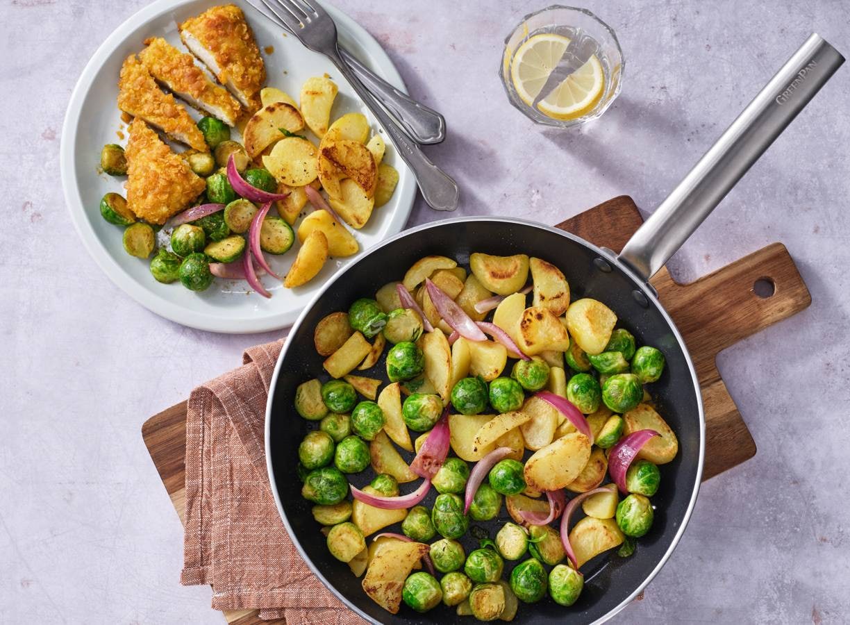 Kipschnitzel met gebakken aardappelen en spruitjes