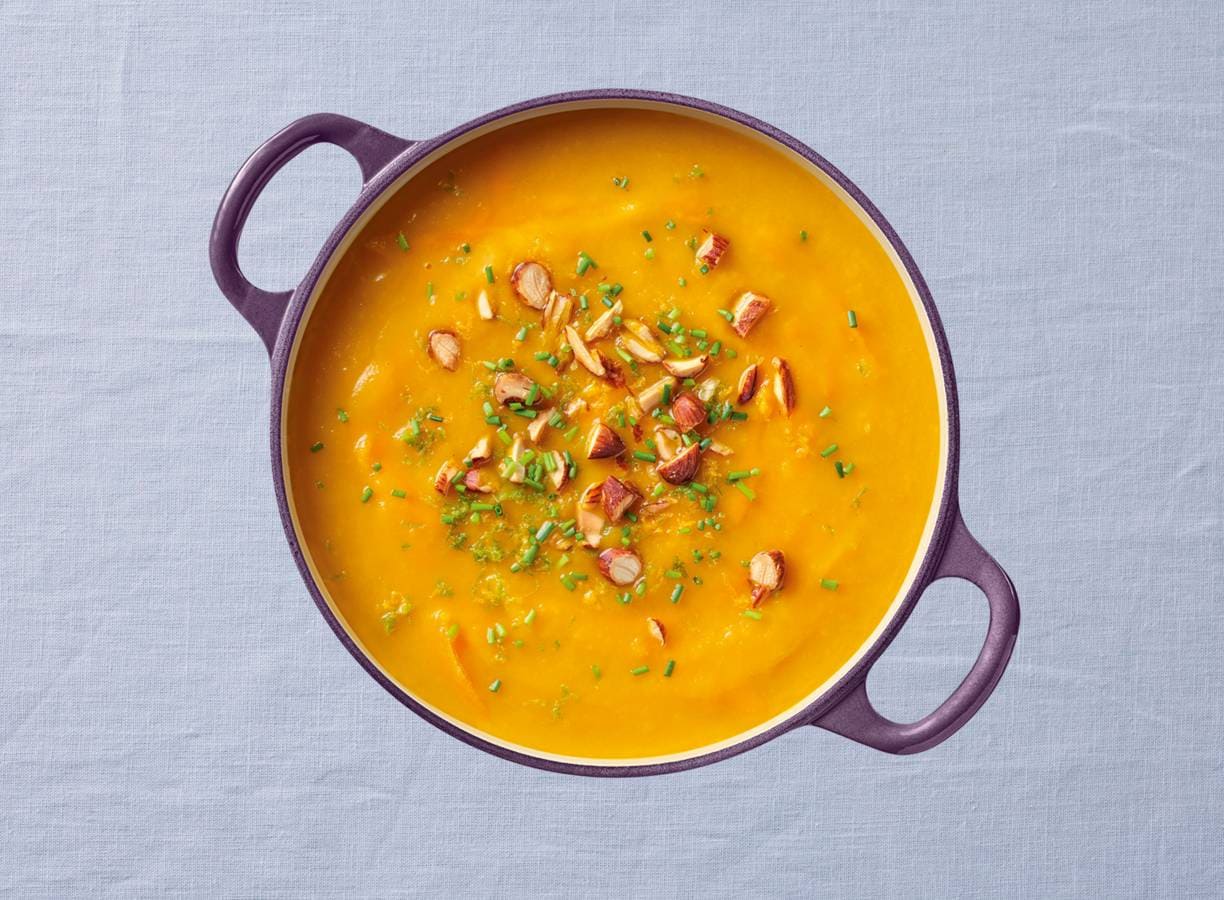 In een handomdraai een lekkere, verse wortelsoep! Lekker met amandelen en een zoet-zuurtje van de sinaasappel. Hartstikke handig allemaal in een verspakket.