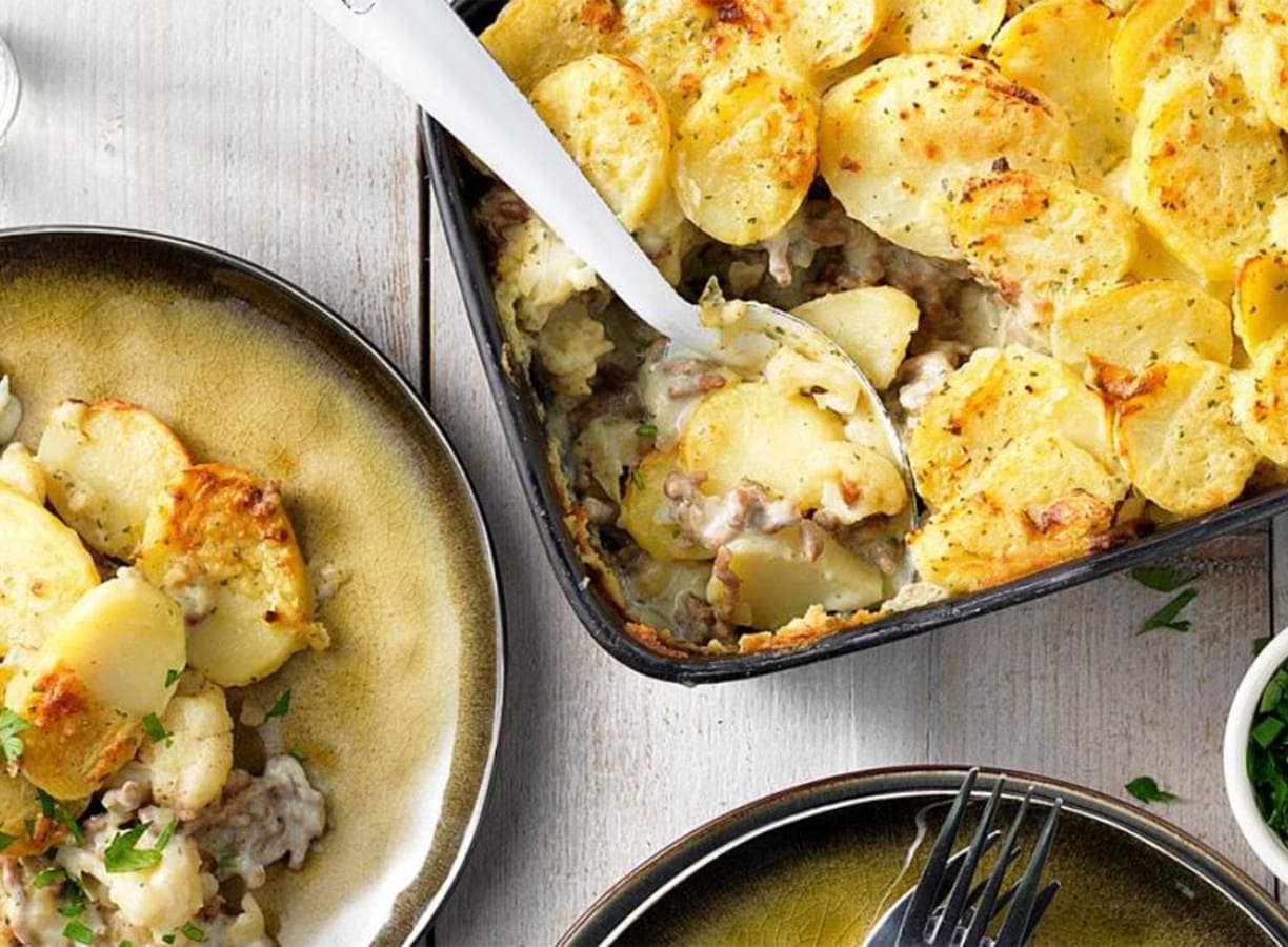 Vet de ovenschaal in en verdeel de bodem met de helft van de voorgekookte aardappelschijfjes. Doe hier bovenop het gehakt met de bloemkool.
