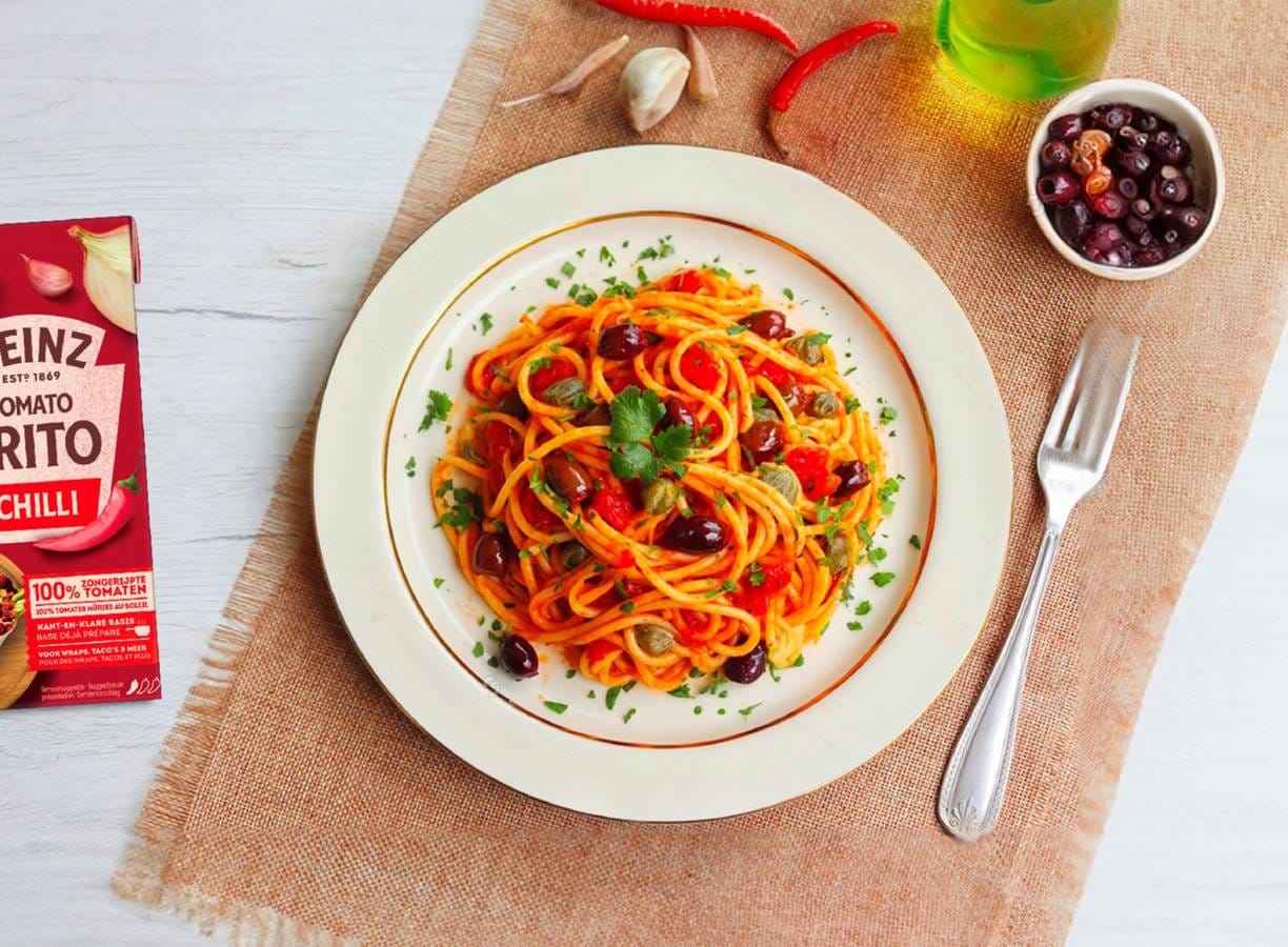Koken met Heinz Tomato Frito®: maak je pasta in een handomdraai rijker door er een pittige draai aan te geven met de Heinz Tomato Frito® Chilli!