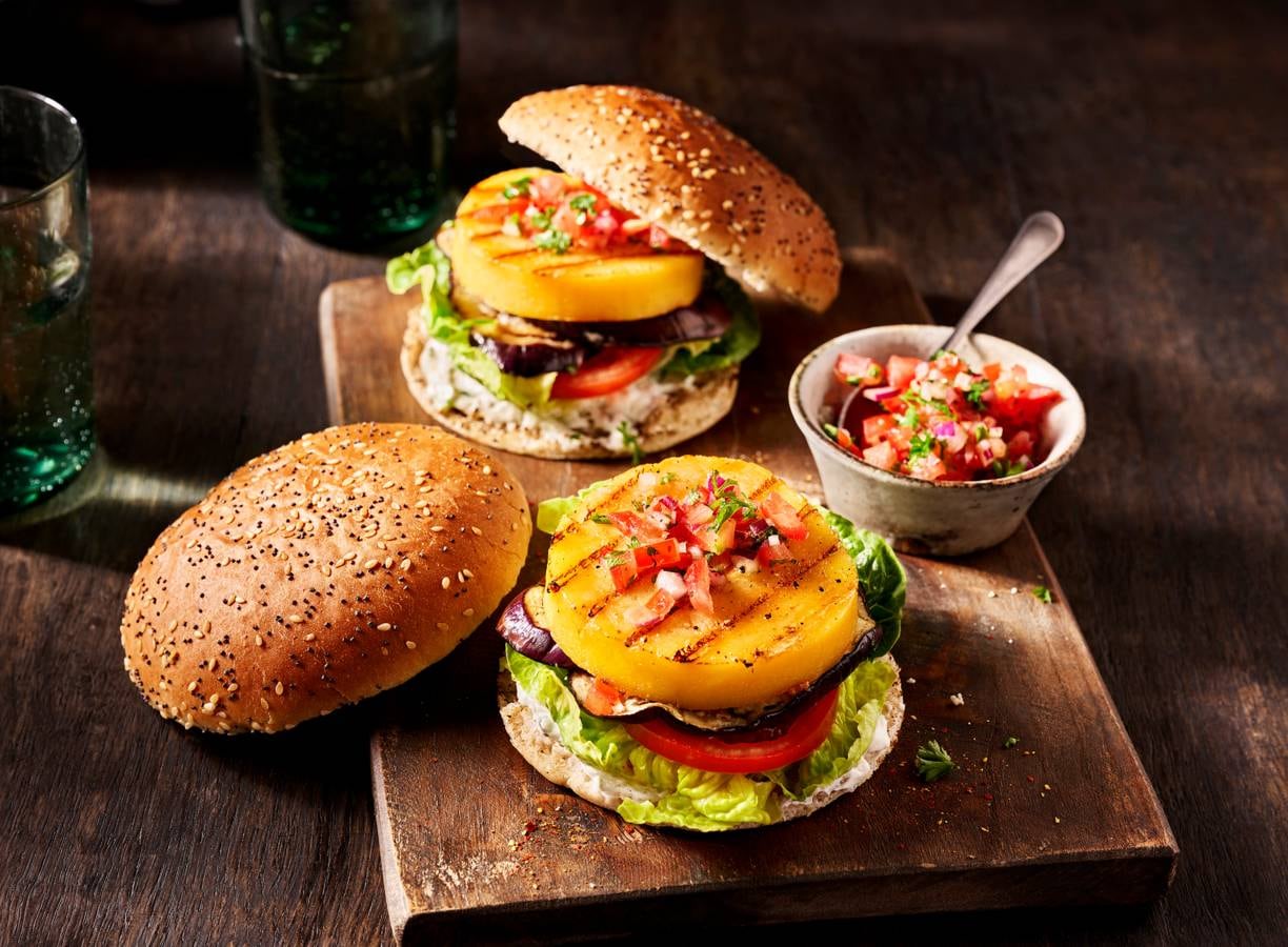 Leg de gegrilde kaasburger daarop en schep er wat salsa op. Dek af met het ‘hoedje’.