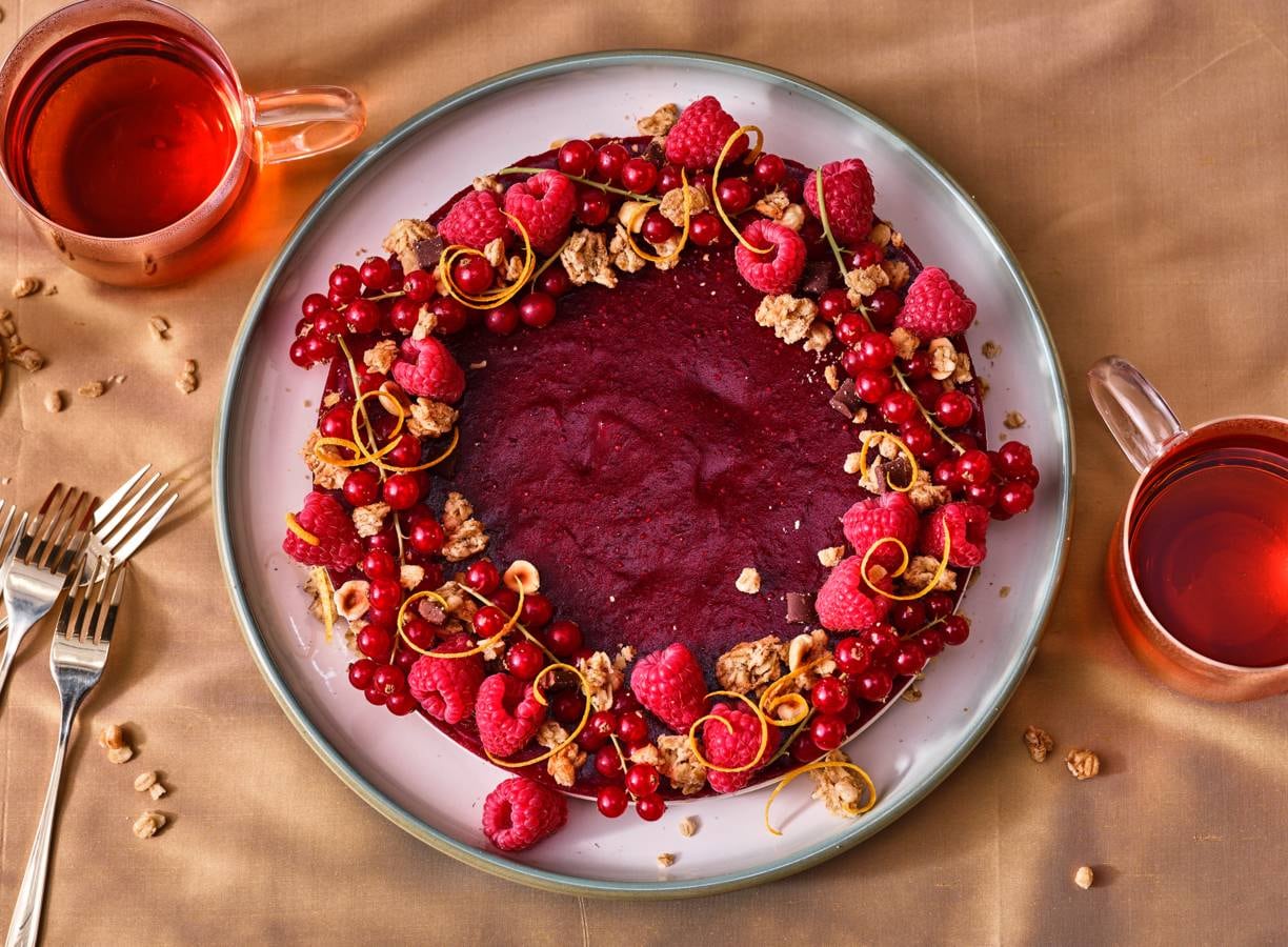Kerstwaardig is-ie, deze taart met heerlijke crunchy bodem. En dat zonder dat er een oven aan te pas komt.
