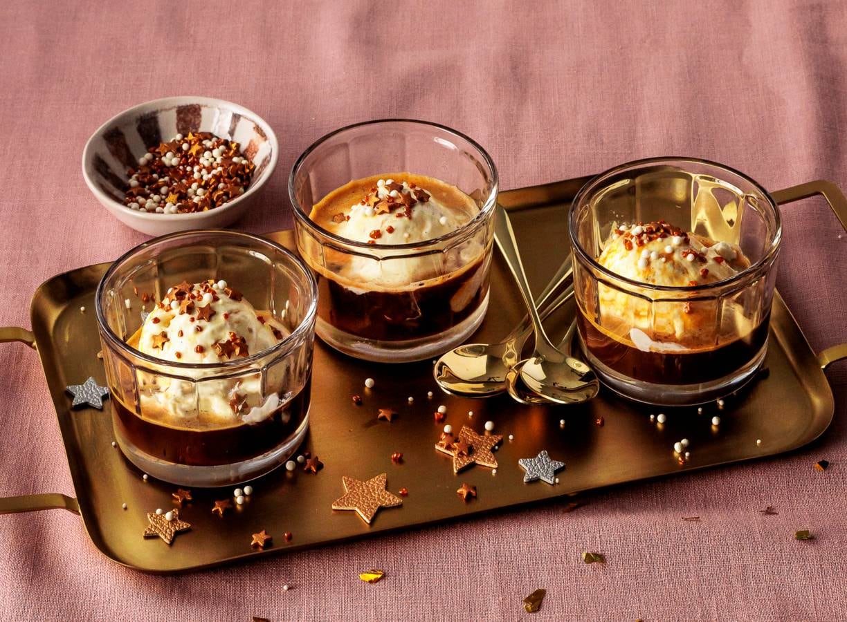 Haal het ijs uit de vriezer en laat in 10-15 min. op temperatuur komen. Schep met de ijsschep een bolletje ijs in een koffiekopje of -glaasje. Doe een koffiecapsule in de koffiemachine. Schenk de koffie, naar gewenste sterkte, over het ijs. Bestrooi met sterrenmix. Maak zo alle affogato’s. Serveer direct.
