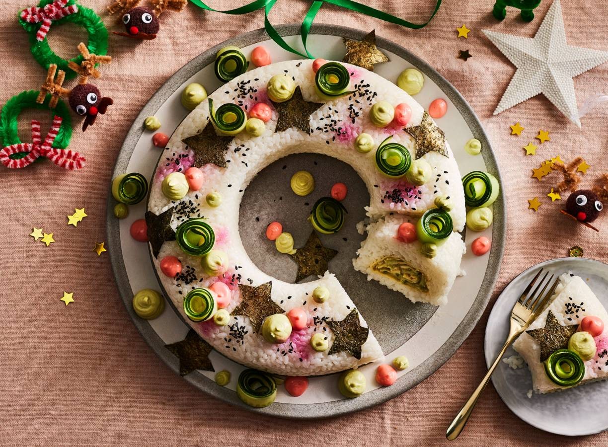 Deze sushikrans spant de kroon tijdens jouw (kerst)diner. Je maakt dit prachtige voor- of bijgerecht met omelet, komkommer en avocado. Maak af met roze mayo, noristerren en roze spray.