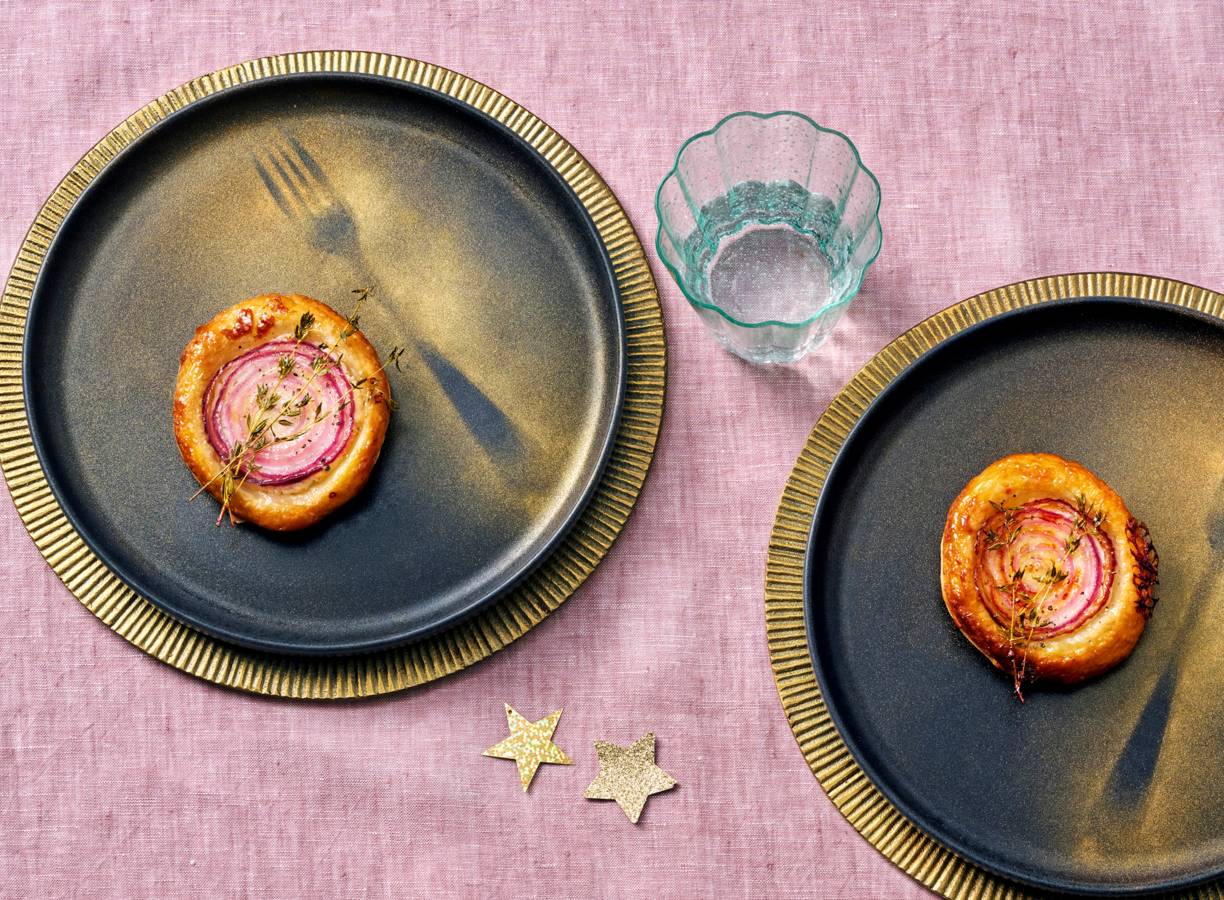 Verrassend makkelijk, deze upside-downgeitenkaastaartjes! Smaakvol met honing en tijm, feestelijk met goudspray. Ideaal als voorgerecht, want de bereiding duurt maar 10 minuten. Hup de oven in en een halfuur later kan je al aan tafel.