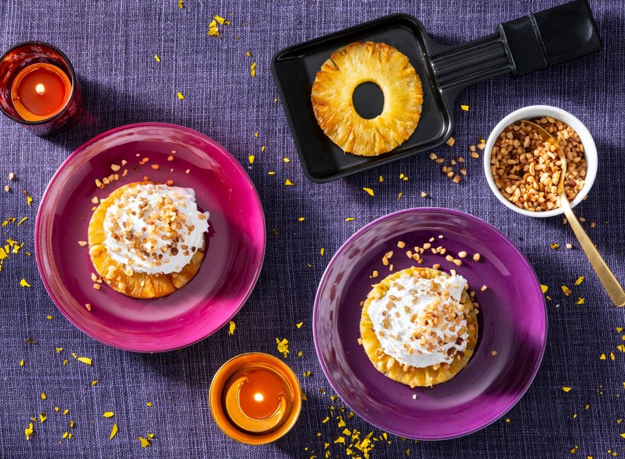 Verhit de plantaardige margarine op de bakplaat van het gourmetstel en bak de ananasschijven 6 min. Keer halverwege. Garneer elke schijf met een toefje soja-topping (plantaardig alternatief voor slagroom) en verdeel de nougatine erover.