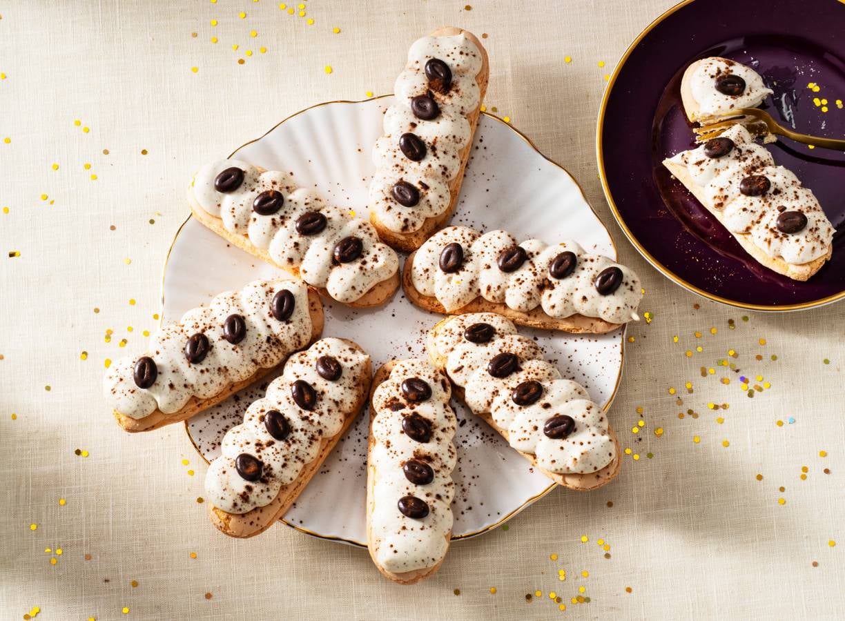 Verdeel de mascarpone over de pistokeddos. Strooi met een klein zeefje de cacaopoeder erover en garneer met de mokkaboontjes.