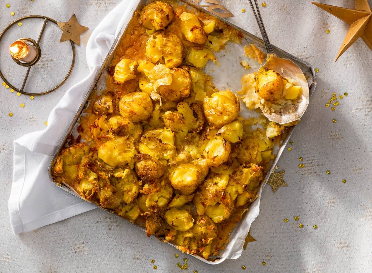 Meng de gesmolten boter door de gekookte aardappelen en breng op smaak met peper en eventueel zout. Verdeel de geraspte kaas over een met bakpapier beklede bakplaat. Verdeel de aardappelen erover en plet met een vork, maar laat ze nog een beetje hun vorm behouden. Bak 35-40 min. in de oven tot ze knapperig en goudbruin zijn.